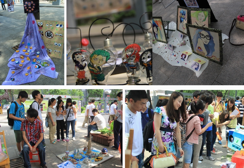 2013年6月24日上午10点,体育与艺术学院艺术系在中央大道成功举办了以“齐绘多彩生活,共筑中国梦想”为主题的手工艺品展。展览期间院党总支副书记曹凤才老师、艺术系主任王旭东老师、院团委书记田维飞老师以及指导教师李嬛等到场参观了展览。