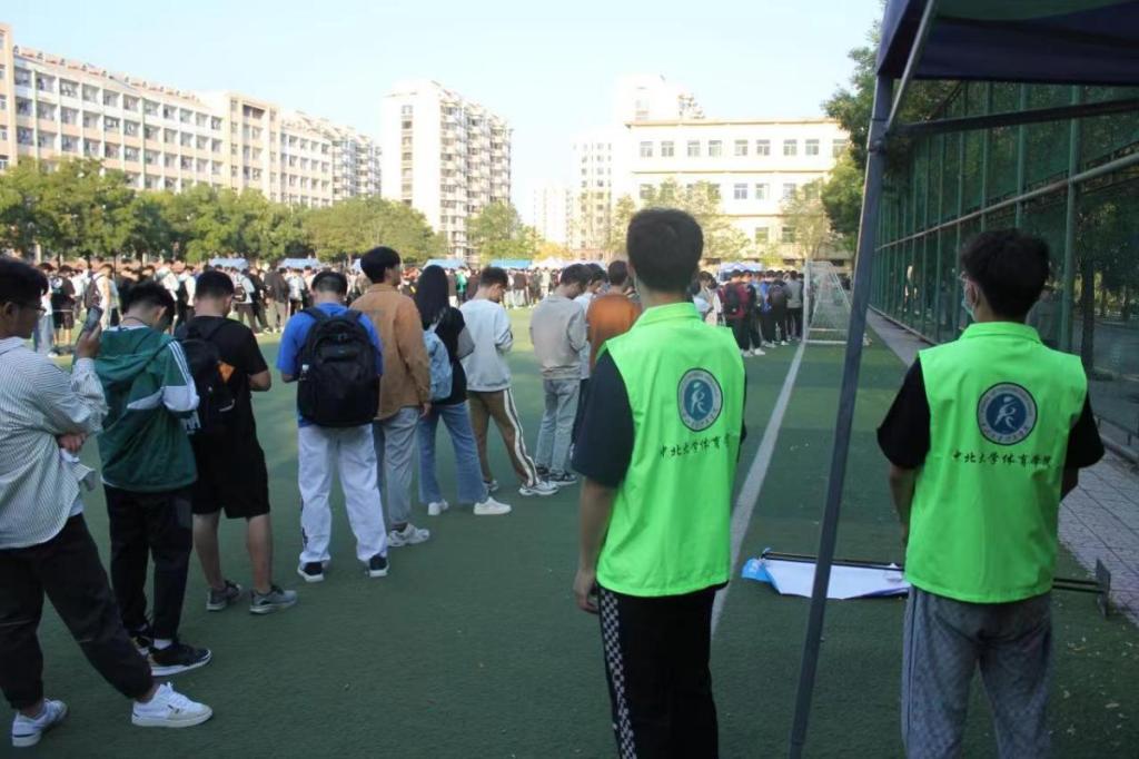 “请大家戴好口罩间隔一米,打开检疫码,有序登记”。9月29日,中北大学西区足球场上荧光绿的志愿者服装在队伍中显得格外亮眼。他们是来自开云online(中国)的志愿者,积极保障和引导同学们有序的完成核酸检测。
