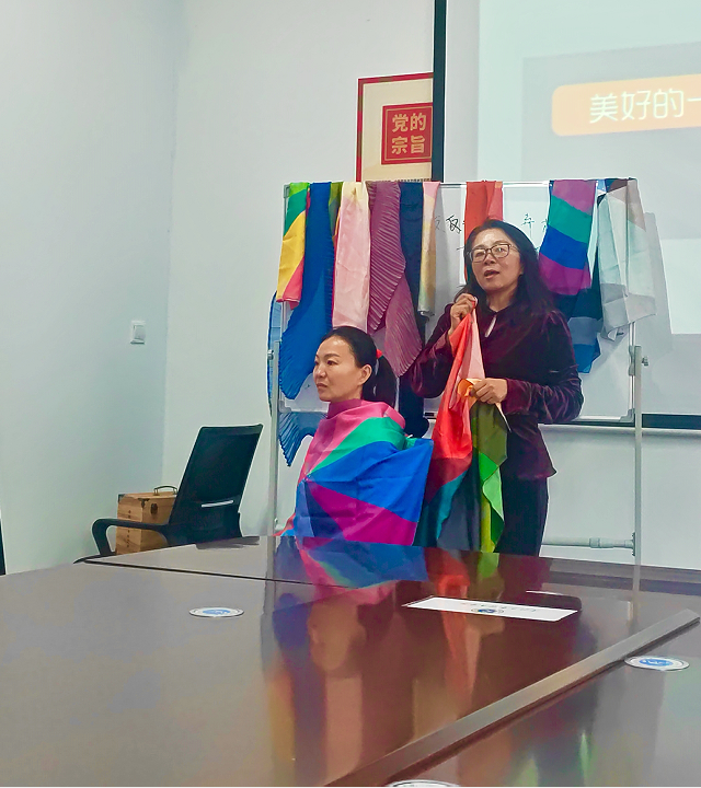 活动伊始,美学专家丁燕老师围绕女性形象设计与色彩搭配展开讲解,提出“极简之美”,主张找到适合自己的基础色和logo色,用衣服展现个人气质特点,提升整体形象。随后,进行现场测试环节,丁燕老师邀请多名老师当模特,用不同颜色对比测试,多角度观察,确定适合自己的基础色和冷暖色调。