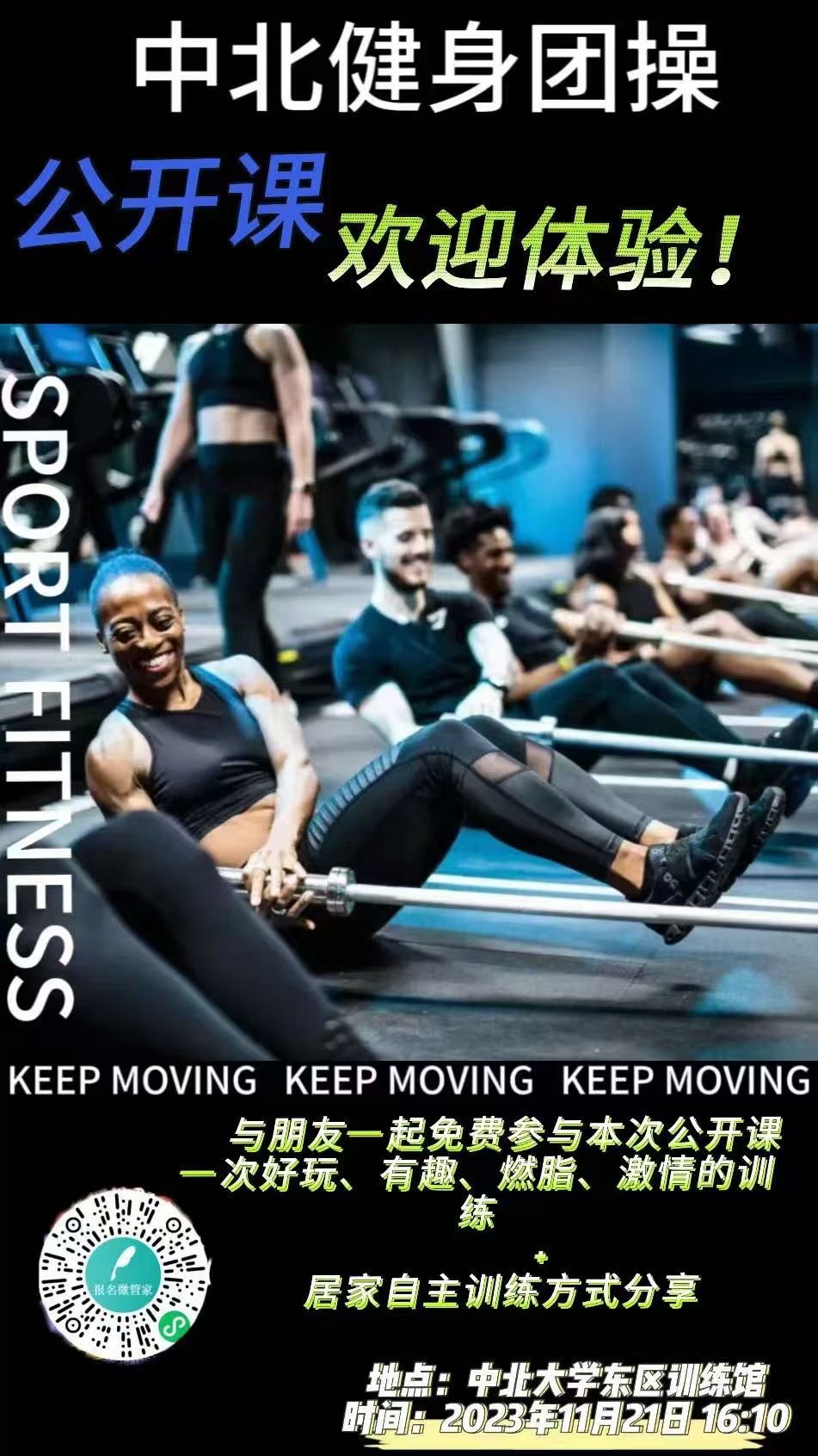 2023年11月21日下午,一场备受瞩目的“中北健身团操公开课”在东区训练馆盛大举行。此次公开课邀请到了两位业内极具影响力的导师前来授课,为现场师生带来了一场精彩绝伦的健身知识与技能盛宴。