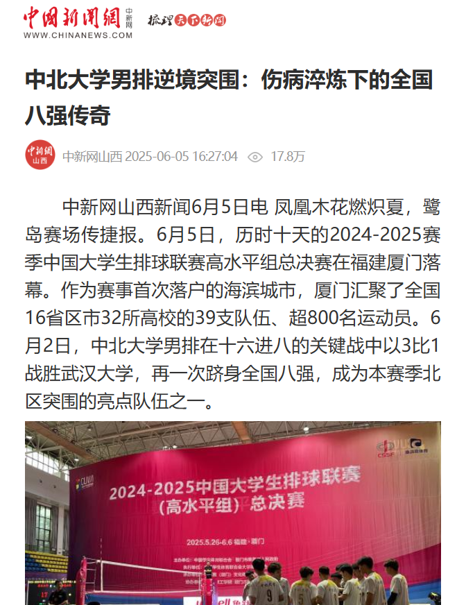 6月5日,2024-2025年中国大学生排球联赛总决赛(高水平组)圆满落幕。我校男排凭借出色发挥,勇夺全国第八名,同时教练王太林荣获"体育道德风尚教练员"称号,实现运动成绩与精神文明双丰收。