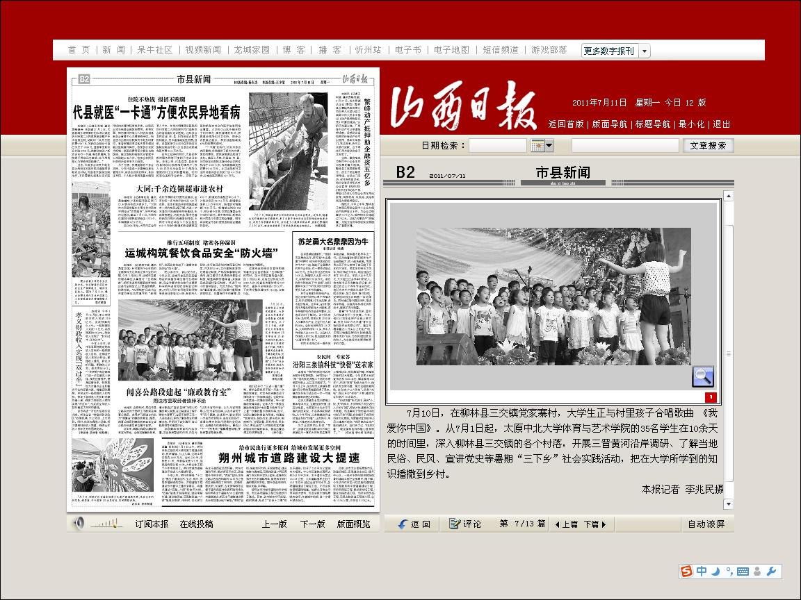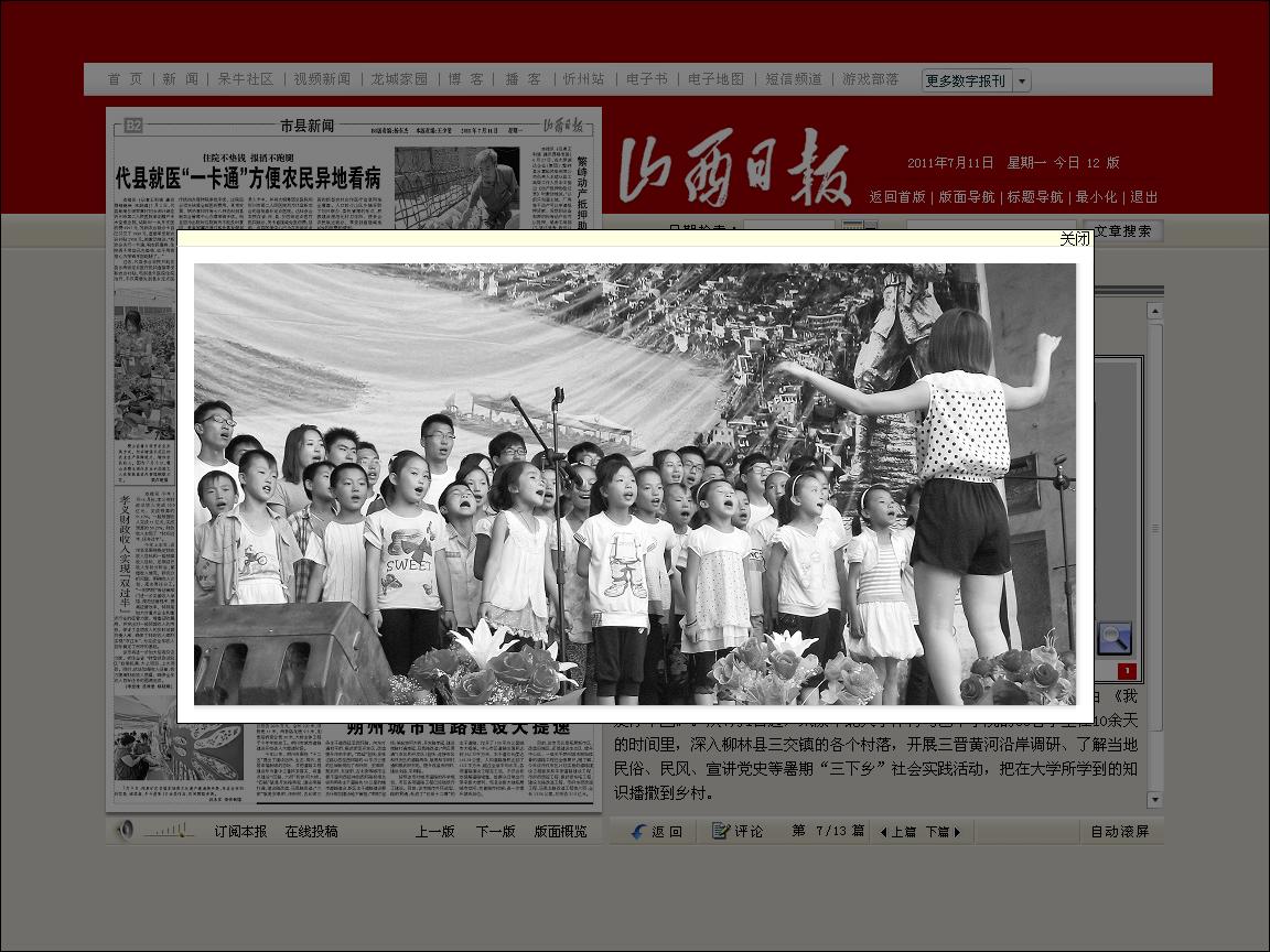 7月10日,在柳林县三交镇党家寨村,大学生正与村里孩子合唱歌曲 《我爱你中国》。从7月1日起,太原中北大学体育与艺术学院的35名学生在10余天的时间里,深入柳林县三交镇的各个村落,开展三晋黄河沿岸调研、了解当地民俗、民风、宣讲党史等暑期“三下乡”社会实践活动,把在大学所学到的知识播撒到乡村。 本报记者 李兆民摄