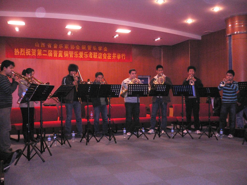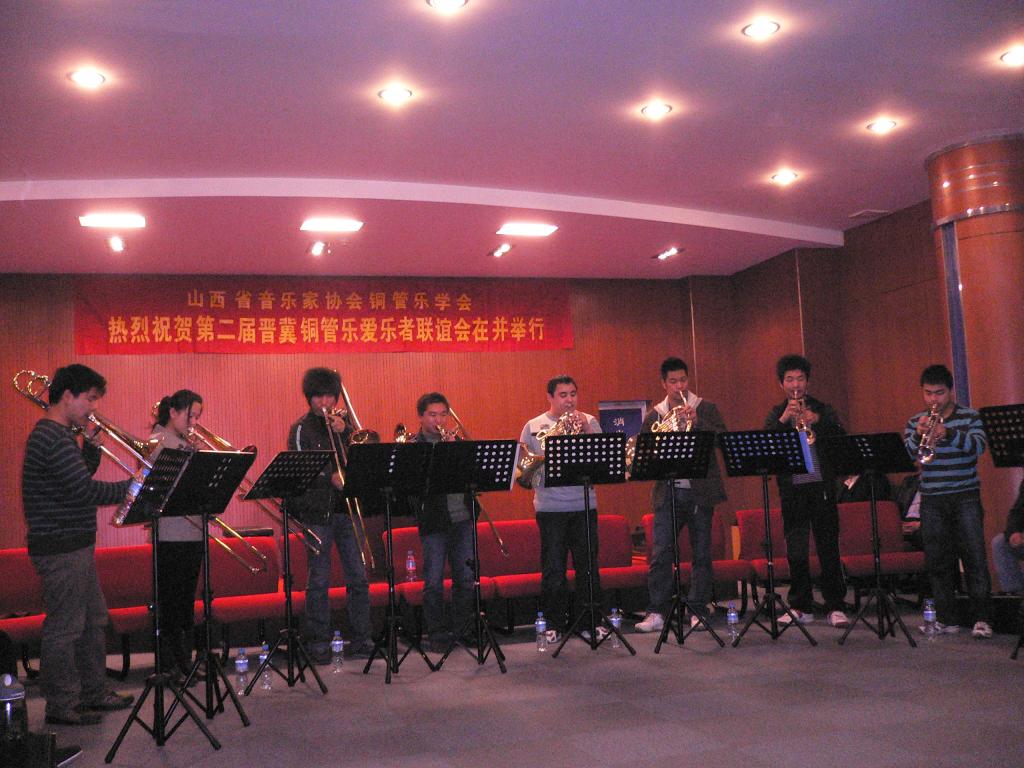 2009年3月9日下午我院音乐系铜管乐专业学生,应邀在省城珠江琴行演奏厅参加了由山西省音乐家协会铜管乐学会举办“第二届晋冀铜管乐爱乐者联谊会”的表演。同学们表演了现代中国作品铜管乐重奏《序奏曲》《山东秧歌》《掀起你的盖头来》《玛依拉》等多首乐曲。两省专家对中北大学音乐系成立三年多来,铜管乐专业能有现在这样不俗的表现,深感振奋和拍手叫好。专家们纷纷鼓励同学们把握机会继续刻苦努力。同学们的表现同时也使各位专家对中北大学有了更加深刻的了解。