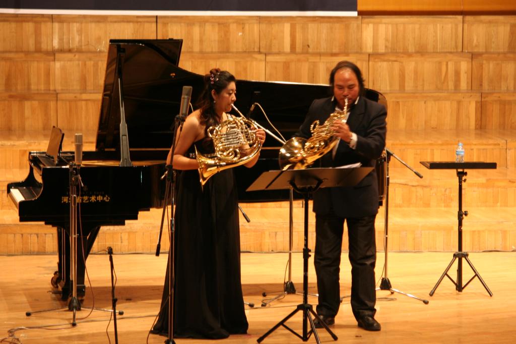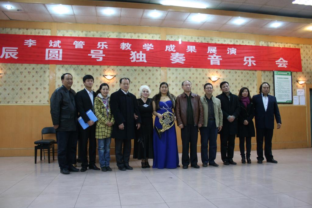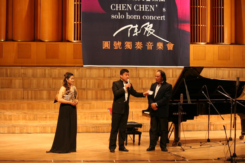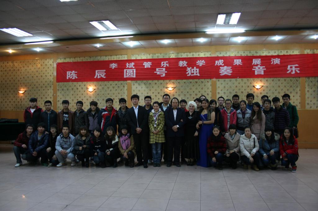 由山西省铜管乐学会、河北交响乐团、中北大学体育与艺术学院、山西大学音乐学院管弦系、山西音乐舞蹈研究所共同主办、太原巴赫音乐培训学校承办的李斌管乐教学成果展演暨陈辰圆号独奏音乐会,于2012年11月14日、15日和22日分别在中北大学排练厅、山西大学音乐厅、河北艺术中心音乐厅举行。连续三场独奏音乐会,得到了晋冀两省广大行内人士和专家以及观众的一致好评。 陈辰,河北石家庄人。11岁在李斌老师的启蒙之下,开始了入门学习圆号。之后,在李斌老师严格、细心地教导下,进入了艰苦的学习旅程。2007年由李斌老师推荐考入了新加坡国立大学杨秀桃音乐学院,师从新加坡交响乐团圆号首席韩小光教授,期间得到过多位国际大师的指导。2011年毕业后考入了河北交响乐团,并继续师从李斌教授深造。 “十二年磨一剑”这三场独奏音乐会的“含金量”可谓李斌老师圆号教学成果的一个缩影。李斌老师常说:“要想给人一杯水,自己须有一桶水”、“作为一名由职业演奏员转变成为的职业教师,必须将两者有机的结合,随时总结,广泛交流、摄取精华、去其糟粕,并不断了解国际圆号演奏与教学发展的前沿动态,才能在教学过程中立于不败之地”。 音乐会首先以一首“BAGATELL”(音乐会小品)展现出来,较全面体现了演奏者上下贯通扎实的基本功底。无伴奏圆号独奏“圣歌”则是以现代作曲技法,运用圆号宽广的音域,反差的力度对比,似乎是人与神在对话以及人在神面前祈祷的一幕。继而刘红军的中国作品“景颇短曲”,佛朗兹•施特劳斯的“夜曲”,莫扎特第二圆号协奏曲1、2、3乐章,结束了上半场演出;下半场首先是前苏联作曲家格里埃尔的声乐协奏曲第一乐章,为使音乐会锦上添花,与陈辰出自同门的中北大学音乐系在校生插演了圆号四重奏“魔笛序曲”,使观众耳目一新。紧接着一首理查•施特劳斯的第一圆号协奏曲1、2、3乐章结束了全场演出。在观众的热烈掌声中,陈辰与恩师李斌教授加演了一曲F大调奏鸣曲圆号教学二重奏选段和柴可夫斯基第五交响曲第二乐章片段。 担任本次钢琴伴奏的是白俄罗斯著名的钢琴演奏家、教育家、罗佳•娜塔莉亚博士等。先后观赏本次李斌管乐教学成果展演的领导有中北大学教务副处长刘兴来教授、李仰军教授,体育与艺术学院刘定一院长、音乐系王燕平主任、韩晋宁副主任;山西大学音乐学院书记朱鲁军教授、管弦系主任张贵禄教授。山西长笛学会吴骥会长、山西省文化厅创作室前主任费泽彪先生,山西省艺术职业学院、戏剧职业学院等有关人士;河北交响乐团团长齐大伟先生、副团长杜建国、高峻岭先生,河北管乐学术委员会会长贾利慰先生以及河北师大音乐学院等有关人士亲自赠送了贺信贺词和花篮。