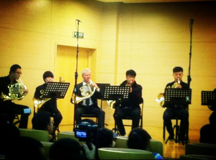 体育与艺术学院音乐系李斌教授带领7名学生一同进行了学习交流。我校学生们分别由各位国际顶级大师进行了公开授课,大师们肯定了他们学习过程中的优点,更重要的是使同学们意识到和改正了自己的不足。在闭幕式大师音乐会5个节目中,特邀中北大学圆号重奏组穿插了圆号四重奏莫扎特歌剧“魔笛序曲”,同学们敢与大师们同台演奏的平和心理素质以及认真的演奏表现,博得了大师们和现场观众的热烈掌声。来自新加坡交响乐团圆号演奏家高健先生说:中北大学音乐系建立不久,但圆号教学水平竟然这么快的踏入了国内高校的前列,真是令人震惊。来自厦门大学兼职圆号教授厦门爱乐乐团圆号首席王洪光先生感慨道:中北大学管乐教学早有耳闻,今日圆号四重奏的表演果真让人刮目相看。对中北大学圆号表演的赞扬声比比皆是。