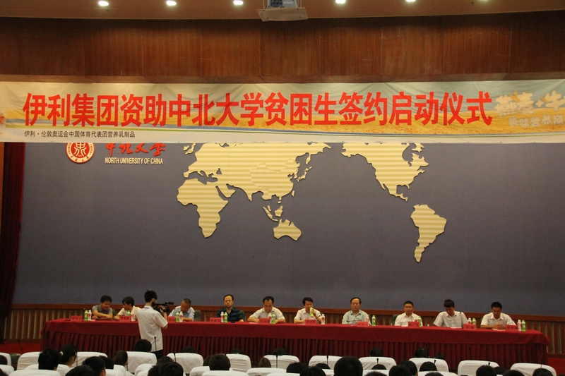 2012年6月14日上午11点,在图书馆五层学术报告厅,我校与内蒙古伊利实业集团股份有限公司,举行了资助贫困生奖学金签约启动仪式。中北大学副校长沈兴全,伊利集团液态奶事业部PET全国销售助理总监闫向前,晋冀蒙营销总部PET经理韩广军,山西偶然食品有限公司总经理韩国林,中北大学学生处处长邱建国,中北大学体育与艺术学院院长刘定一,中北大学体育与艺术学院副院长曹电康以及内蒙古伊利实业集团股份有限公司有关部门负责人等参加了签约仪式。会议由中北大学体育与艺术学院党总支副书记曹凤才主持。