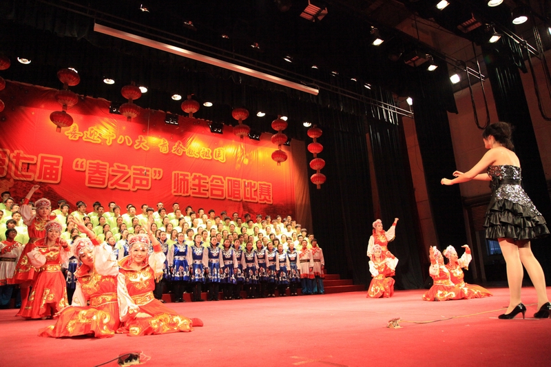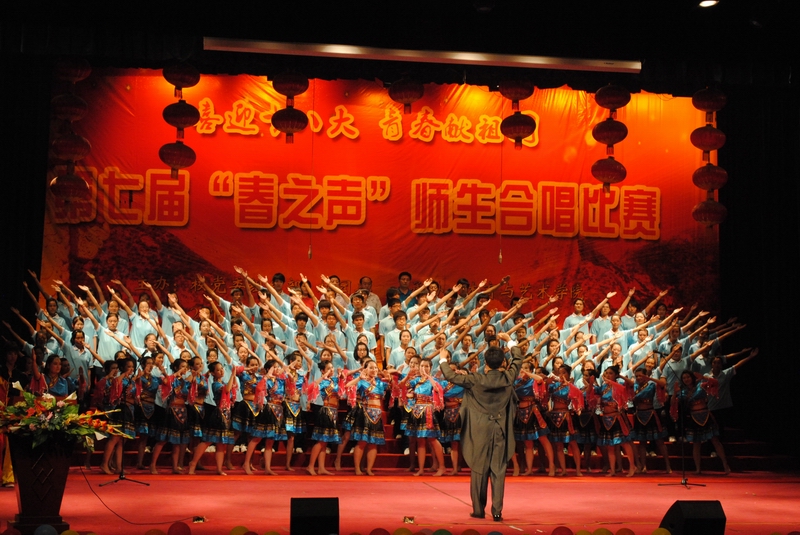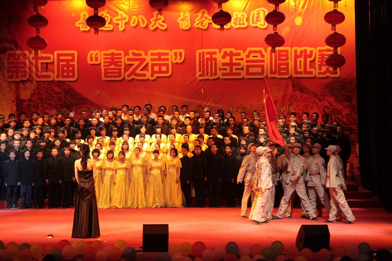 巍巍太行,锁不住阵阵中国风;滔滔黄河,淹不尽浩浩中华魂。为推进我校创先争优活动的深入开展,迎接党的十八大的胜利召开,讴歌中华民族实现伟大复兴的奋斗历程,追寻革命先辈光辉足迹,颂扬中国共产党的丰功伟绩,同时展现我校师生团结合作、乐观向上的精神面貌,为此在 5月18日晚7:00,由校党委组织部、校团委主办,体育与艺术学院承办的“喜迎十八大,青春献祖国”师生合唱比赛在科艺苑隆重举行。