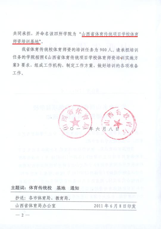 近日,山西省体育局、教育厅联合下发《开云网页版页面命名山西省体育传统项目学校师资培训基地的通知》,命名我院为山西省体育传统项目学校师资培训基地。