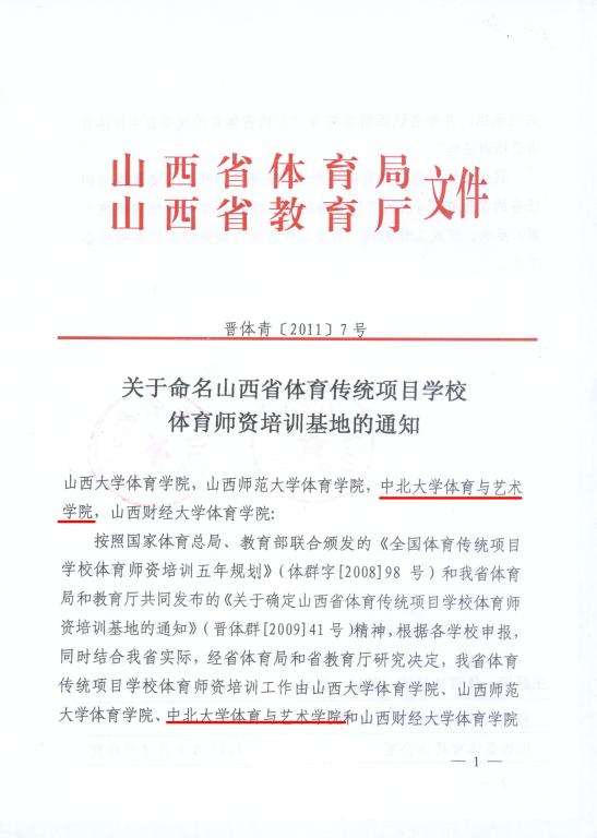 文件指出,为贯彻落实《全国体育传统项目学校体育师资培训五年计划》,不断提高我省体育传统项目学校体育教师的实际教学能力,加强体育师资队伍建设,进一步发挥体育传统项目学校在组织广大学生积极参加阳光体育运动,努力提高课余训练水平,促进体教结合方面的示范作用。经对我省各体育院校体育场地,师资队伍、教学能力的实地考察,决定命名中北大学体育与艺术学院为省体育传统项目学校师资培训基地。