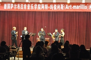 为了加强中德两国的文化艺术交流,在教师节即将到来之际,我校于9月5日晚8:00在自然声响相对较好的田园四层举行了“喜迎教师节---德国萨尔布吕肯音乐学院阿特·玛锐利斯木管重奏组音乐会”。本场音乐会由山西省音乐家协会铜管乐学会主办,我校体育与艺术学院、服务集团和信息商务学院承办。来自不同岗位的教职工、体育与艺术学院及其他院系的音乐爱好者观看了音乐会。音乐会由服务集团副总经理赵振波同志致欢迎辞。
