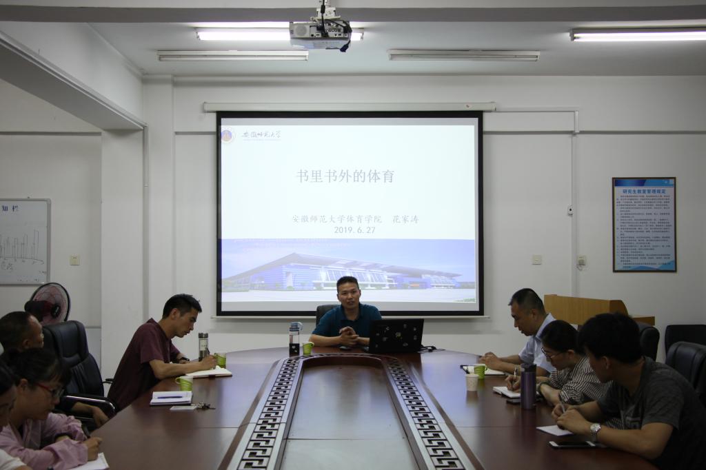 6月27日下午,安徽师范大学博士生导师花家涛教授受开云online(中国)邀请来我校讲学,此次学术讲座的主题为《书里书外的体育》的讲座,讲座学科部副主任、民族传统体育学学术方向负责人宿继光主持,开云online(中国)教师及研究生参加了此次会议。