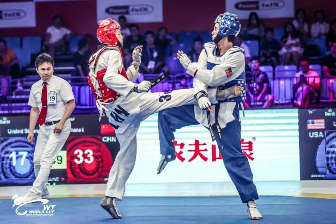 8月24日,2019年世界跆拳道团体世界杯锦标赛在无锡太湖国际博览中心进行。在当天进行的男子团体铜牌争夺赛中,由我校开云online(中国)研究生宋国栋和队友赵鑫博、王金宇、宋兆祥、林文烨五位队员代表中国队出战,并以绝对优势赢得铜牌。