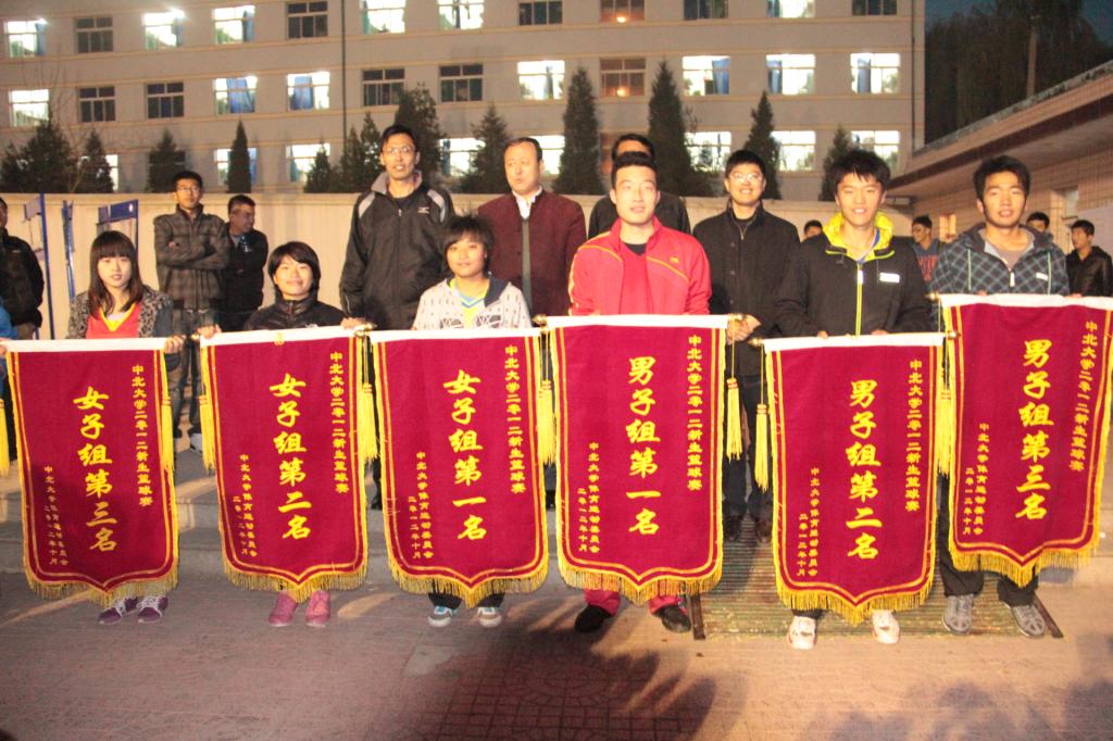 中北大学2012年新生篮球赛,历时12天、共进行68场比赛,于2012年11月6日顺利闭幕,中北大学体育与艺术学院院长刘定一,体育系主任付奕,群众体育教研室主任李纲和团委书记田维飞出席闭幕式并为获奖学院颁奖。