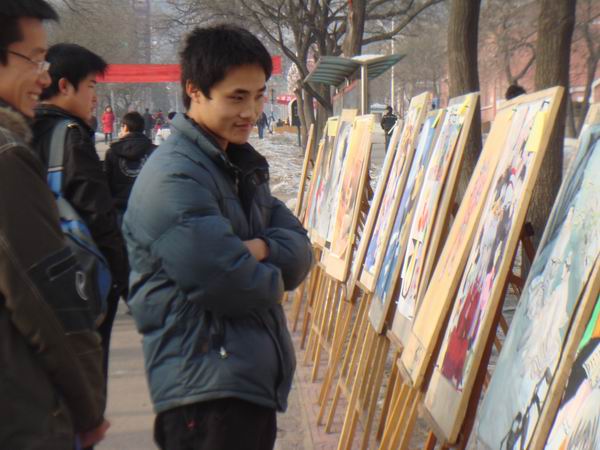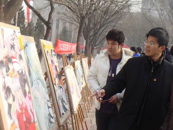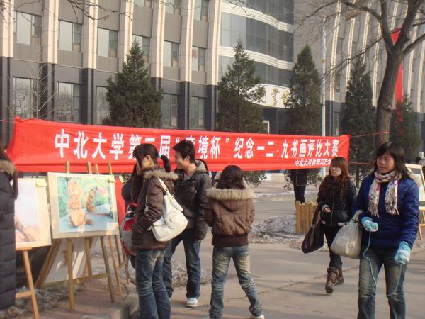 12月9日上午10:30,在中北大学图书馆门前,由体育与艺术学院举办的纪念“一二·九”运动七十四周年“意境杯”书画展在如火如荼的场面中举行。