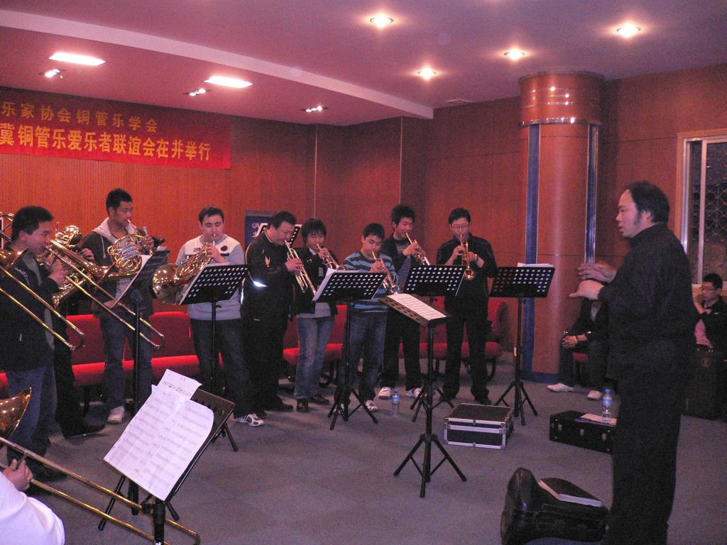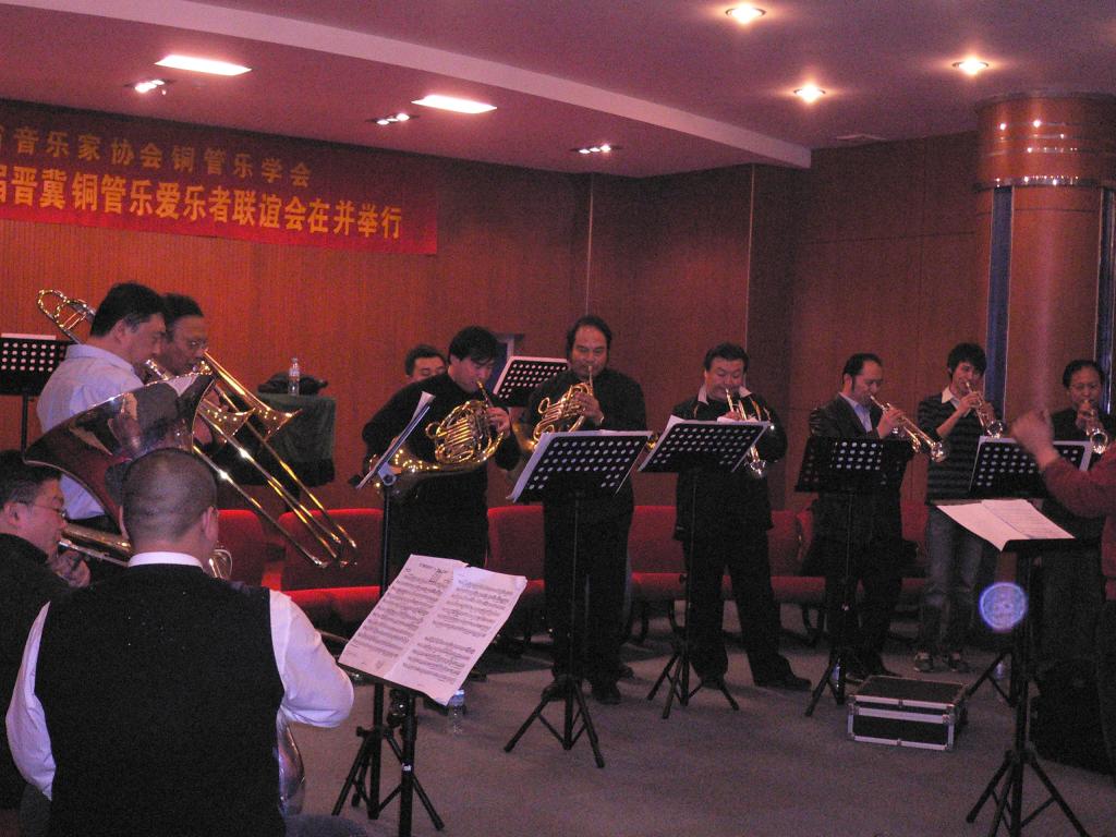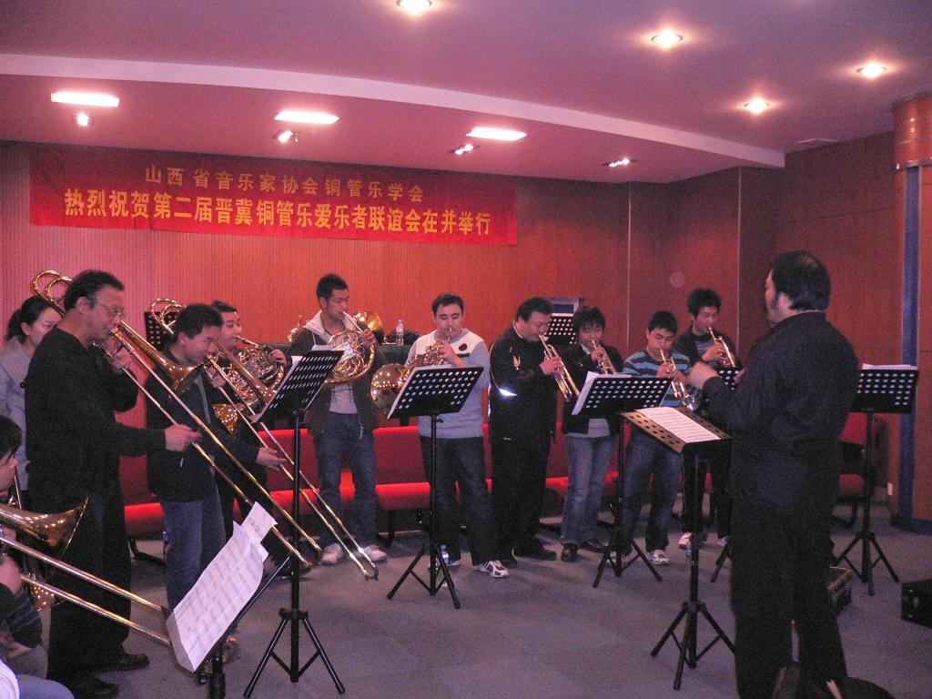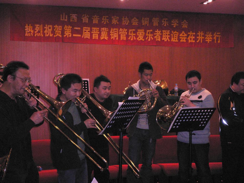 2009年3月9日下午我院音乐系铜管乐专业学生,应邀在省城珠江琴行演奏厅参加了由山西省音乐家协会铜管乐学会举办“第二届晋冀铜管乐爱乐者联谊会”的表演。同学们表演了现代中国作品铜管乐重奏《序奏曲》《山东秧歌》《掀起你的盖头来》《玛依拉》等多首乐曲。两省专家对中北大学音乐系成立三年多来,铜管乐专业能有现在这样不俗的表现,深感振奋和拍手叫好。专家们纷纷鼓励同学们把握机会继续刻苦努力。同学们的表现同时也使各位专家对中北大学有了更加深刻的了解。 联谊会活动是由我院音乐系国家一级演奏员李斌老师与山西铜管乐学会会长张贵禄等省城著名铜管乐人士主持,并精心组织排练与交流。李斌老师是晋冀铜管乐活动主要发起人之一。目前的社会兼职是:国际圆号协会会员,中国音乐家协会会员,中国圆号学会副会长,山西铜管乐学会副会长,河北交响乐团特邀圆号首席。 参加此次活动80余人的师生分别来此北京管乐厂的工程师、河北交响乐团、河北白领铜管乐爱乐人士、中北大学体育与艺术学院音乐系,山西大学音乐学院,山西戏剧职业学院,山西艺术职业学院,山西省歌舞剧院交响乐团。联谊会的终旨是:联络友谊、增进了解、相互学习、扩大交流,以达到共同分享和谐的快乐为目的。