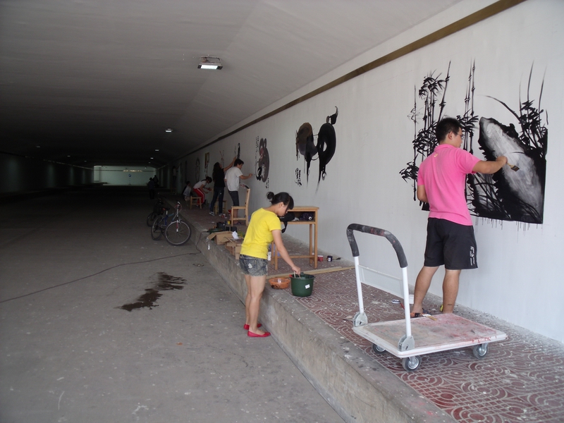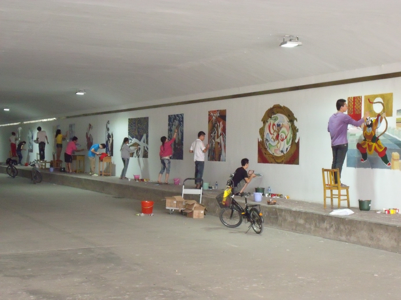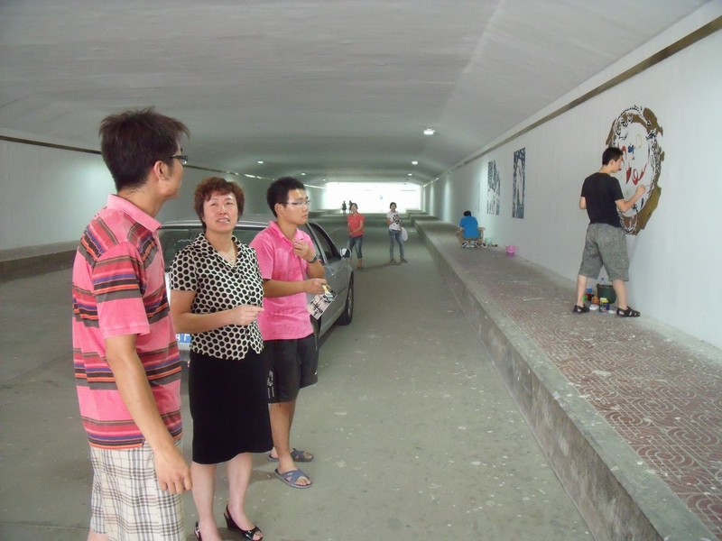 2011年7月26日,体育与艺术学院党总支书记王琳老师来到中北大学地下通道前来看望正在此处创作壁画的艺术系学生。此次留在学校为中北大学校庆七十周年画壁画的学生共有11人,其中,一年级学生5名,二年级学生6名,在艺术系系主任王旭东老师和此次壁画的指导老师申旭栋老师的带领下为校庆做贡献。